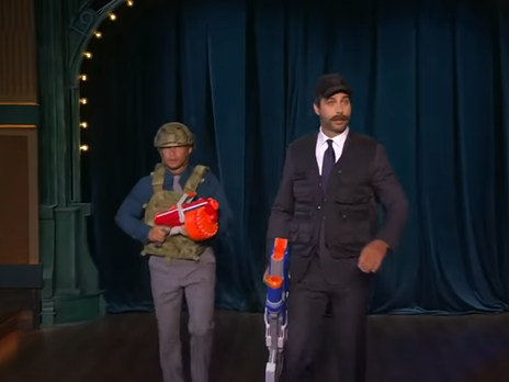 На початку передачі Ургант і його співведучий Дмитро Хрустальов вийшли до глядачів з іграшковими водяними автоматами і в бронежилетах.