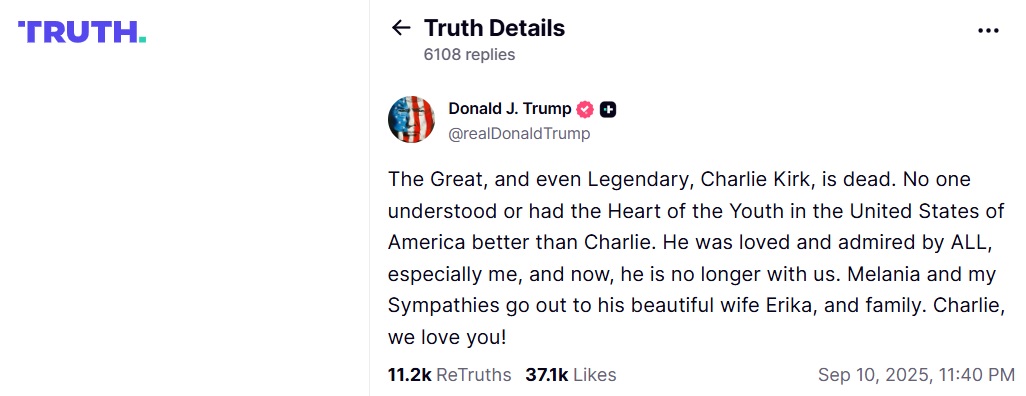 "Великий і навіть легендарний Чарлі Кірк помер. Ніхто не розумів і не співпереживав молоді у США краще за Чарлі. Його любили й захоплювалися ним усі, особливо я, і тепер його більше немає з нами", – написав глава Білого дому.