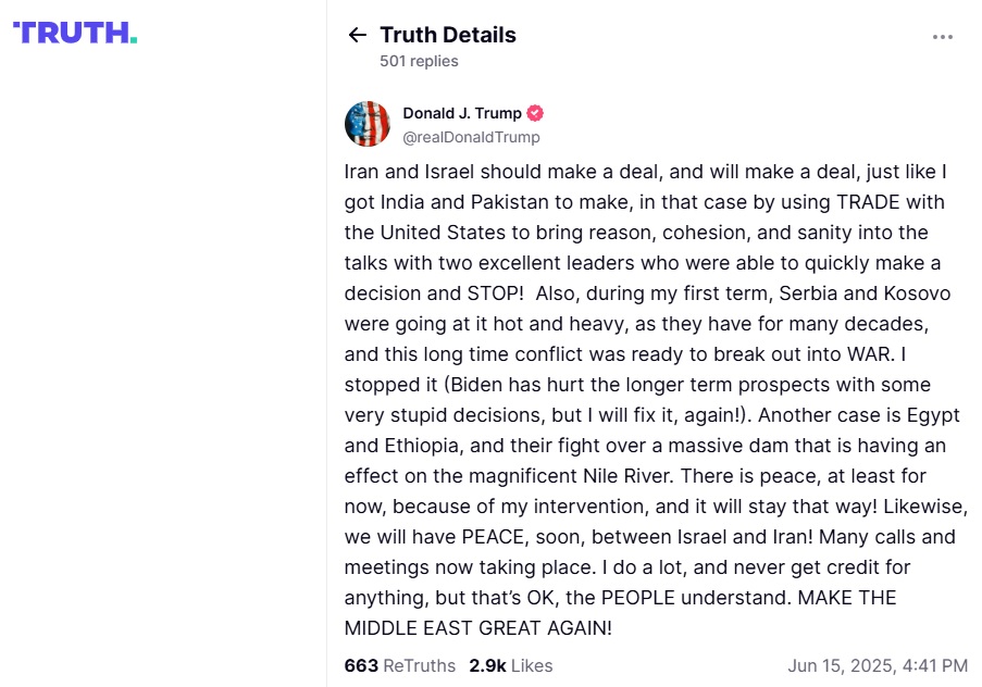 15 червня Трамп заявив, що можна "легко укласти угоду між Іраном та Ізраїлем і покласти край цьому кривавому конфлікту".