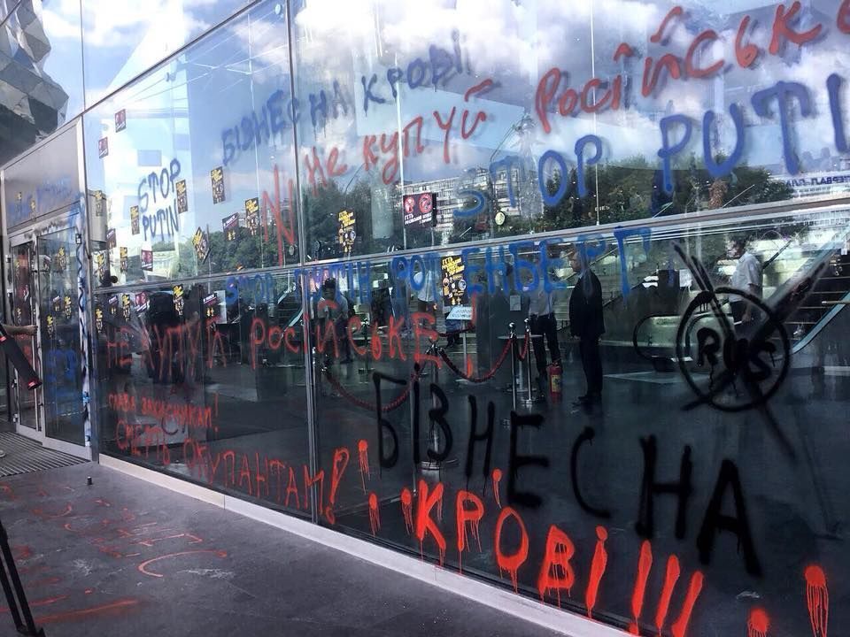 Націоналістичні організації C14 і "Сокіл" 6 липня пікетували у Києві торгово-розважальний центр Ocean Plaza. Про це активісти повідомили у Facebook. За їхніми словами, власник ТРЦ – побратим президента РФ Володимира Путіна мільярдер Аркадій Ротенберг – "має безпосереднє відношення до будівництва Керченського мосту, стягуючи при цьому гроші з українців". Протестувальники запалили фаєри і нанесли на фасад будівлі низку написів: "Геть російський бізнес!", Stop Putin, "Бізнес на крові", "Не купуй російське" тощо. 4 червня газета "Коммерсантъ" повідомляла, що компанія "ТПС Нерухомість", підконтрольна зокрема дочці Аркадія Ротенберга Лілії, веде переговори про продаж Ocean Plaza.