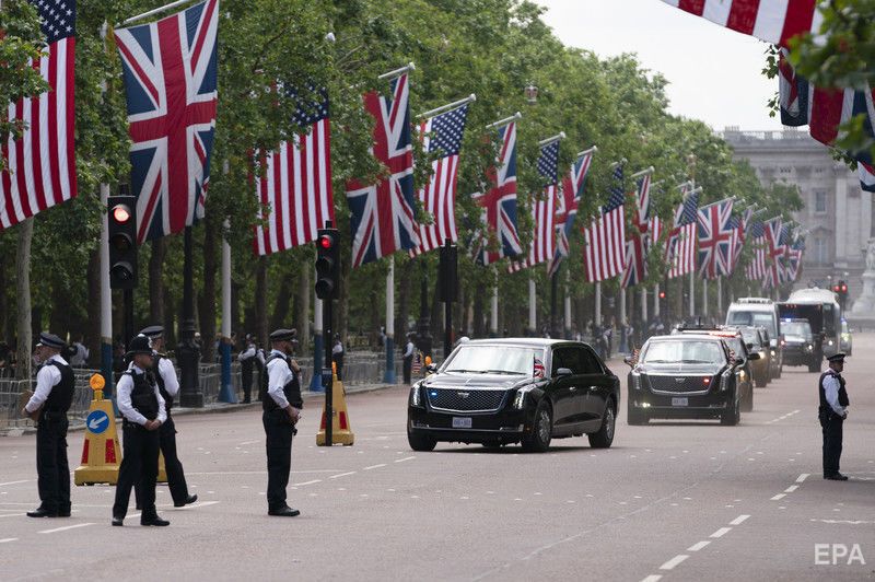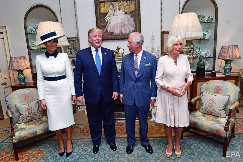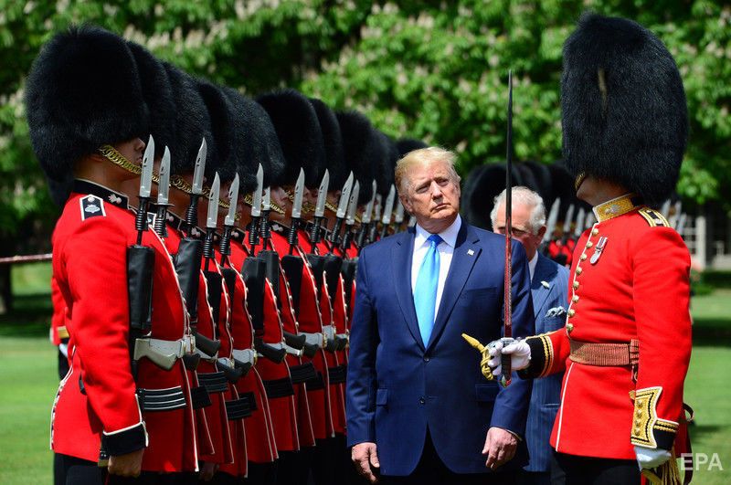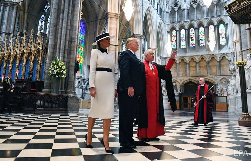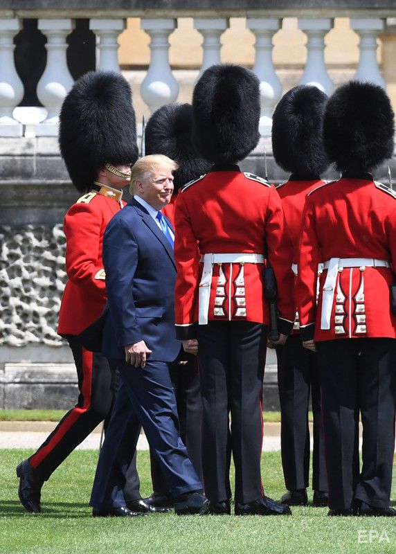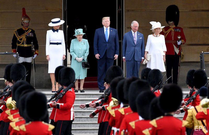 Президент США Дональд Трамп перебуває з візитом у Великобританії. Фото оприлюднило агентство ЕРА. Це перший державний візит американського президента до Лондона, торішня поїздка була робочою. Трамп зустрівся з королевою Єлизаветою II і членами монаршої родини – із принцом Чарльзом і Каміллою, герцогинею Корнуольською, із принцом Вільямом і Кейт, герцогинею Кембриджською, а також із принцом Гаррі. У Букінгемському палаці відбувся банкет на честь Трампа, також він відвідав Вестмінстерське абатство.