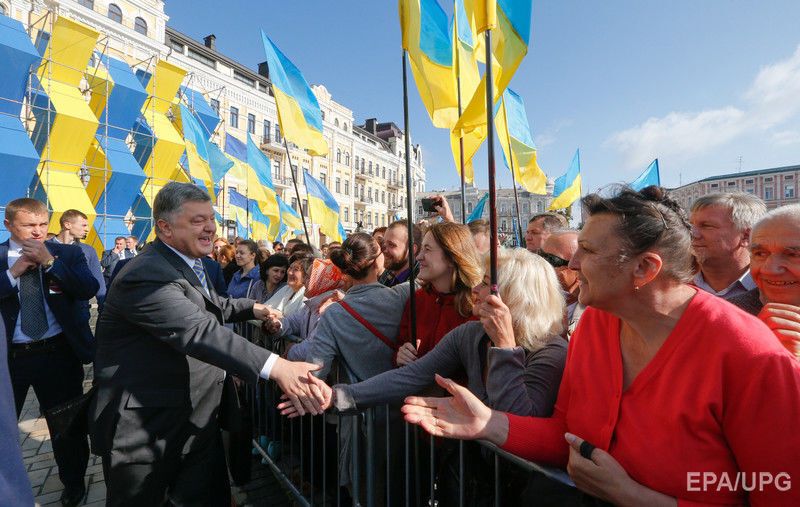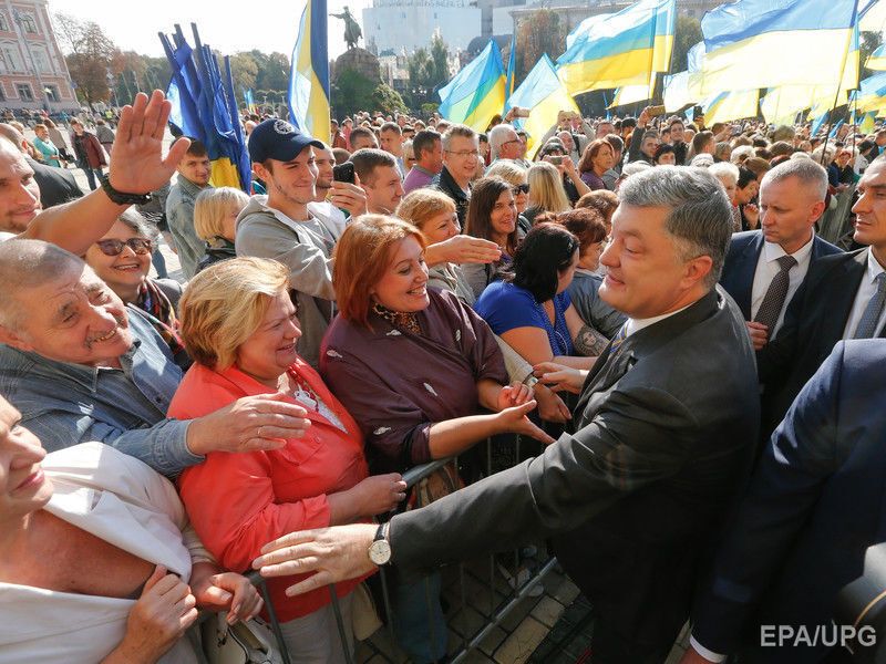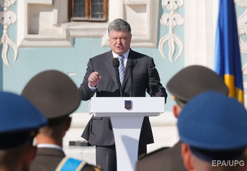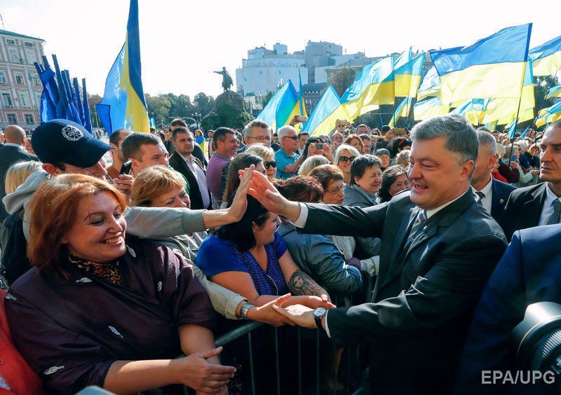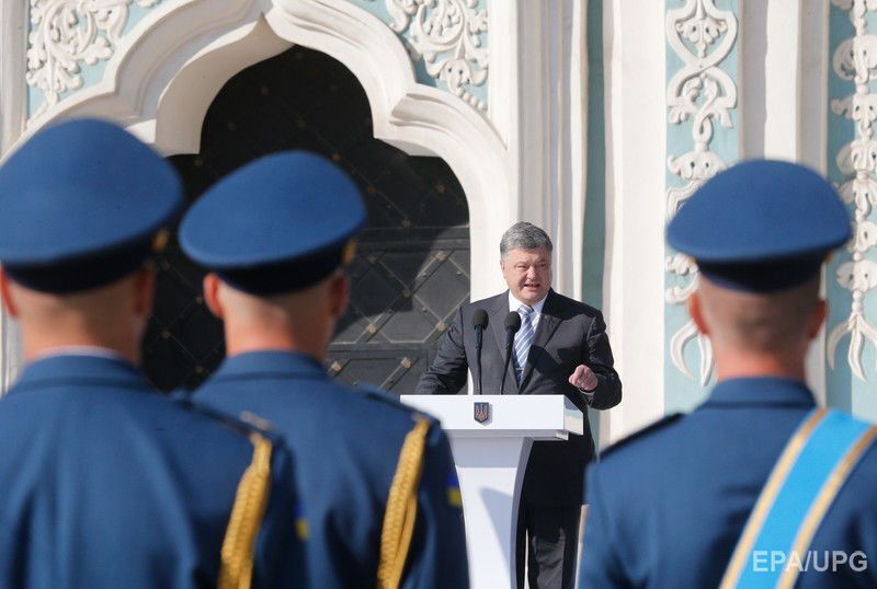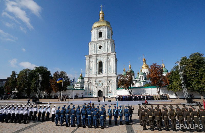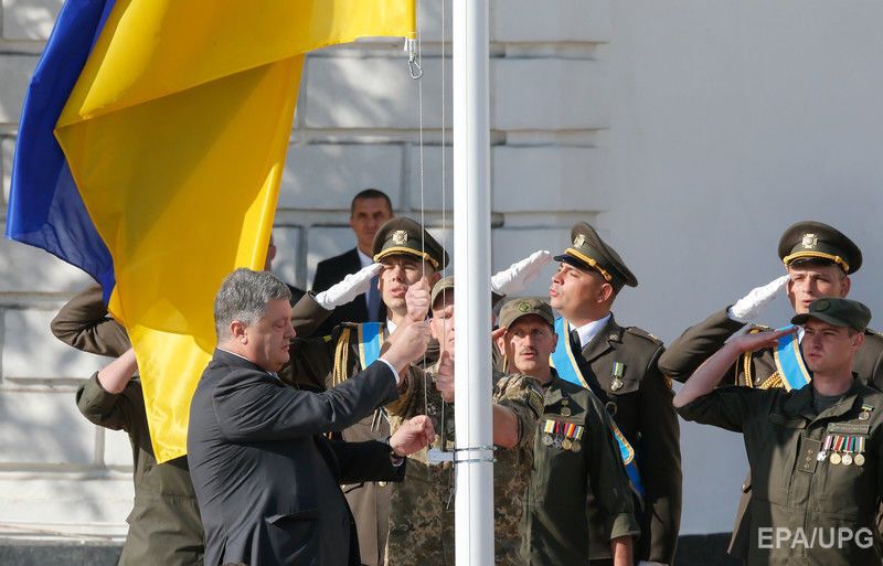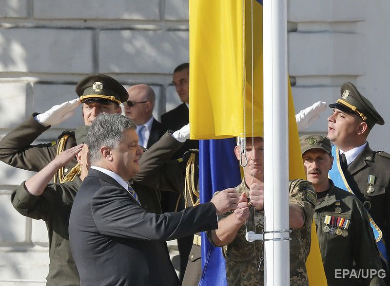 23 серпня на Софійській площі в Києві відбулася церемонія підняття державного прапора України, у якій брав участь президент Петро Порошенко. Фото з церемонії опублікувало агентство EPA. "Зверніть увагу, як нашому прапору пасує сусідство з прапором Європейського союзу. Два з половиною місяці тому ми домоглися вільних подорожей Європою, здійснивши для цього всі необхідні реформи", – заявив президент, вітаючи українців із Днем державного прапора. 23 серпня 1991 року, після провалу путчу в Москві, група народних депутатів внесла синьо-жовтий український прапор до сесійної зали Верховної Ради. Наступного дня було проголошено незалежність України.
