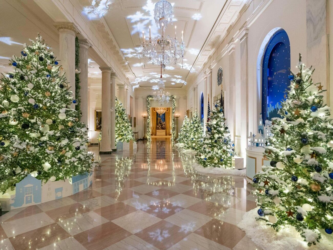 Блакитна кімната присвячена Дару миру та єдності. Тут стоїть головна ялинка Білого дому, щоб її встановити, зняли люстру. Фото: whitehouse.gov