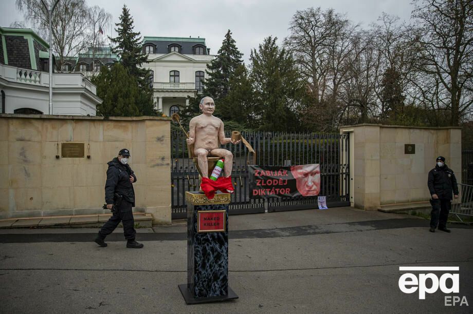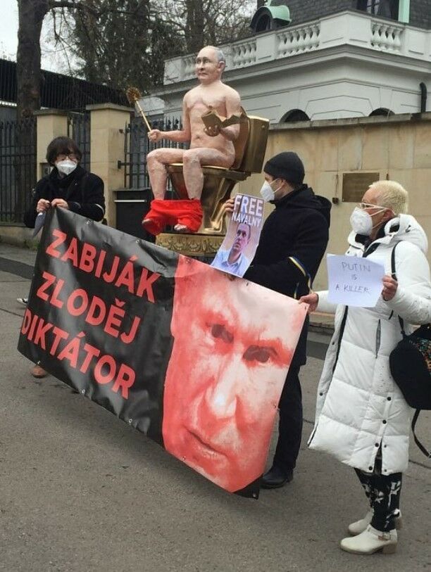 16 квітня кілька активістів із групи "Капутін" прикрасили огорожу посольства Росії у Празі золотими йоржиками та унітазами, а також установили статую президента РФ Володимира Путіна в оголеному вигляді на золотому унітазі й мармуровому постаменті. Про це повідомляють у Facebook організації. Активісти висловлюють протест проти ув'язнення російського опозиціонера Олексія Навального, порушення прав людини в Росії та агресії РФ проти України. "Група "Капутін" намірилася вдосконалити російське посольство в дусі естетики путінської мафії: золоті йоржики та золоті унітази", – пояснили в повідомленні. Акція протесту також спрямована проти чеського уряду, який активісти закликають зберегти прозахідну орієнтацію Чехії, не санкціонувати імпорту російської вакцини "Супутник V", засудити порушення прав людини в Росії, окупацію України та воєнну агресію проти неї.