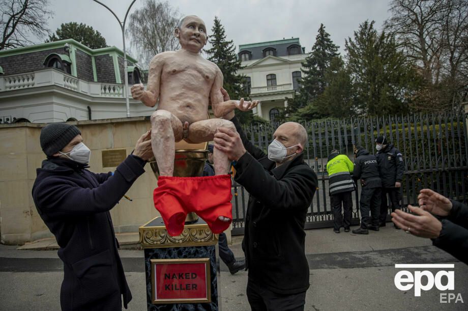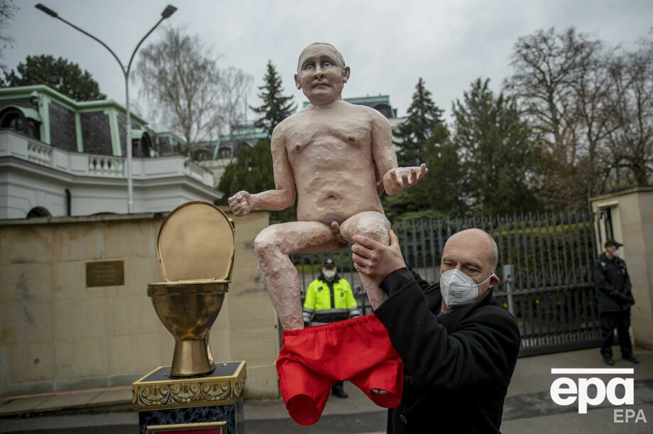 Під посольством РФ у Чехії встановили статую голого Путіна на золотому унітазі. Фоторепортаж