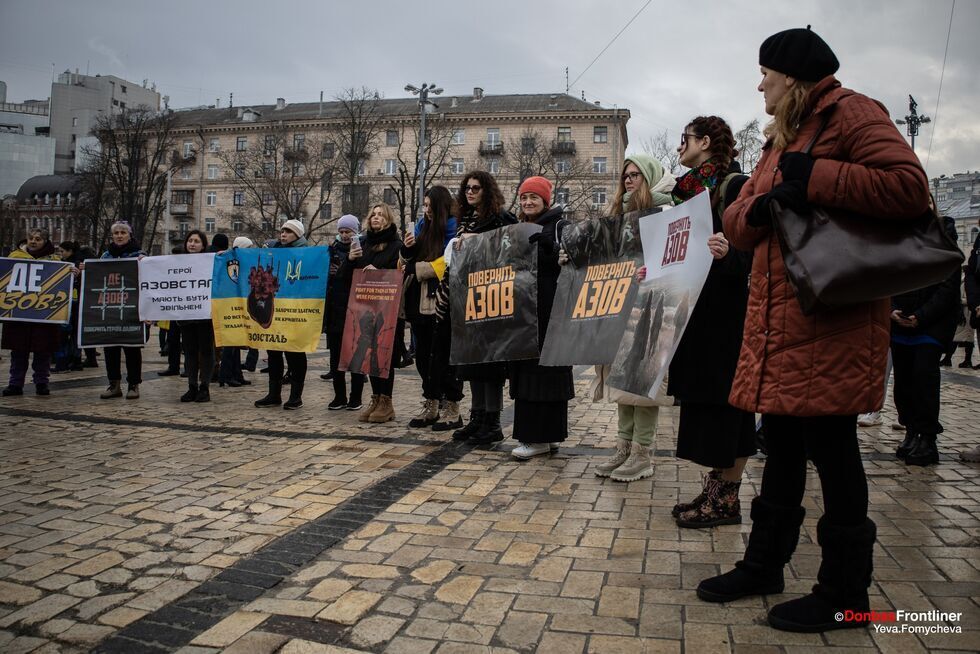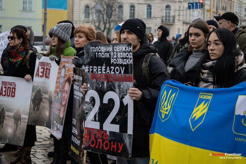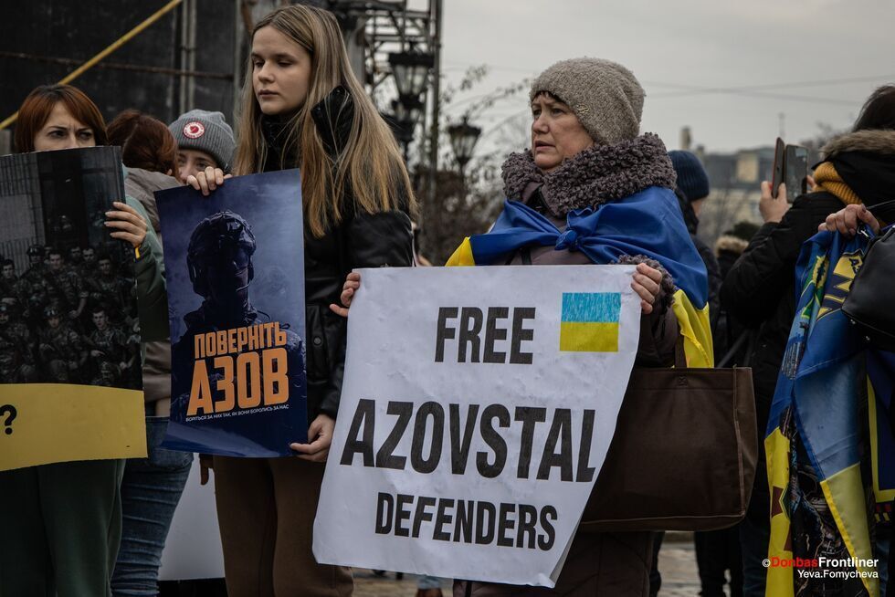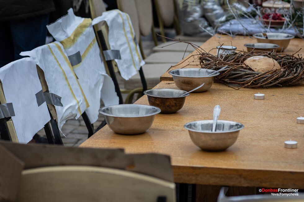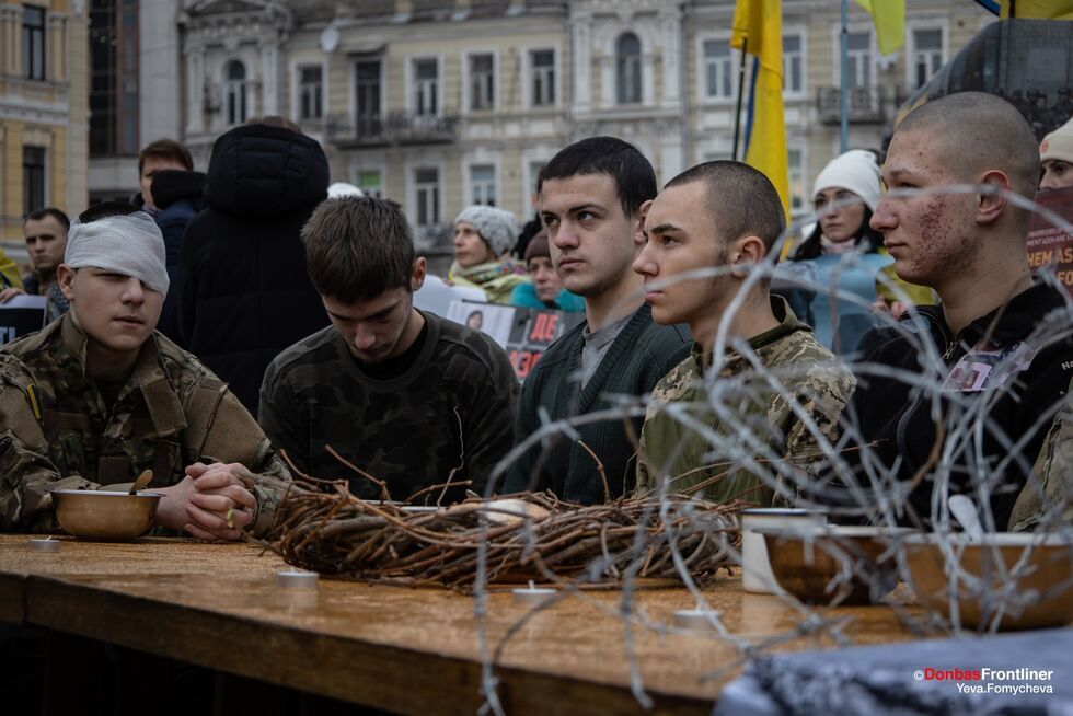 Акцію-перформанс "Різдво в полоні" організували родичі українських полонених, зокрема й захисників "Азовсталі", на Софійській площі в Києві 24 грудня. Фото опублікувало видання Donbas Frontliner у Facebook. Організатори звернулися із закликом до міжнародної спільноти використати всі важелі впливу на Росію, щоб якнайшвидше повернути їхніх рідних додому. Організатори підкреслили, що в людей у полоні немає ні теплого одягу, ні нормальної їжі. "Два столи. Один із традиційними різдвяними стравами, за ним – ошатно одягнені люди. Інший – порожній, зі свічками, металевими мисками й вінком із гілок. Між столами – колючий дріт. Два світи – той, де люди вдома святкують Святвечір, і Різдво в російському полоні", – ідеться в описі акції.