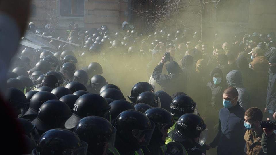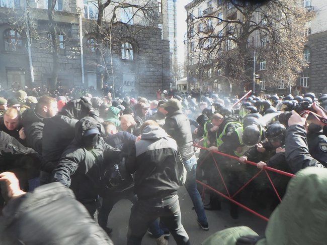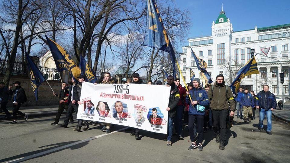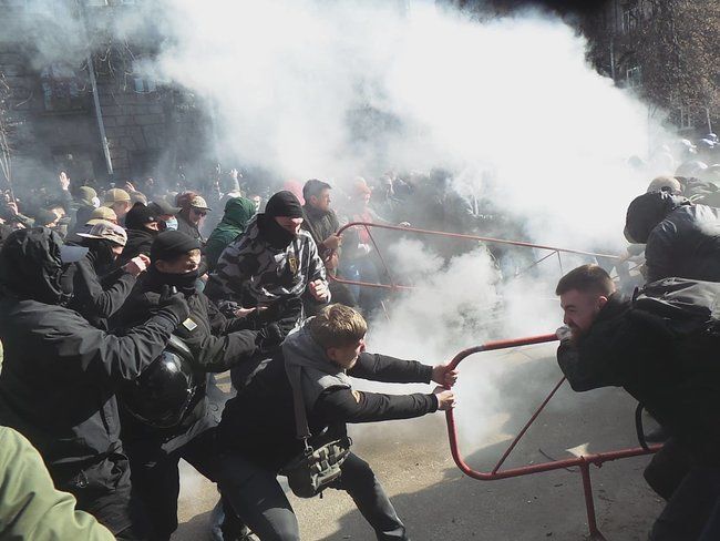 9 березня в Києві біля Адміністрації Президента сталися сутички правоохоронців із націоналістами, які вимагають заарештувати колишнього першого заступника секретаря Ради нацбезпеки і оборони України Олега Гладковського і його сина Ігоря, які фігурують у журналістському розслідуванні про розкрадання в оборонній галузі. Акцію, в якій брали участь представники "національних дружин", проводили під гаслом "Свинарчуків Порошенка – за ґрати!" Очевидці розповідають, що в якийсь момент націоналісти і поліція "пішли в рукопашну", під час сутичок використовували сльозогінний газ, вибухові пакети та димові шашки. Фотографії з місця подій опублікували на сайті "Цензор.НЕТ" і "нацдружини" у Facebook.