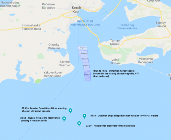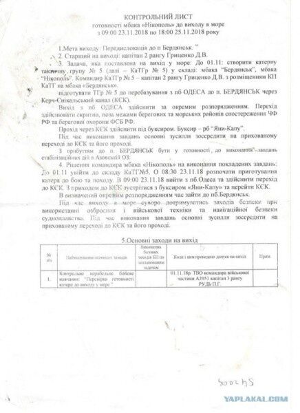 "Перехід здійснювати скритно, поза межами берегових та морських районів спостереження ЧФ РФ та берегової охорони ФСБ РФ. Прохід через КЄК здійснити під буксиром. Буксир – РБ "Яни-Капу". Під час виконання завдань основні зусилля зосередити на прихованому проході до КЄК та його проходженні". По-друге, не має жодного значення, що написано в судновому журналі або будь-якому іншому документі. Що має значення – це те, які саме дії було здійснено або ж не здійснено українськими кораблями. Інформували їхні капітани про свій намір пройти протокою російські служби чи ні. Як відомо, українські кораблі підійшли до Керченської протоки і, перебуваючи ще на відстані не менше ніж 20 миль до найближчого берега, офіційно поінформували російські технічні служби про намір пройти протокою. Для уточнення того, що було насправді, можна скористатися навіть не українськими заявами, а офіційним документом ФСБ Росії: "05.35 БАК "Бердянськ" (позивний "Шхуна-175") повідомив на пост технічного спостереження (м. Такіль) про планований прохід кораблів ВМС України (буксира "Яни Капу" (позивний "Десна-947"), БАК "Нікополь" (позивний "Шхуна-176"), БАК "Бердянськ" (позивний "Шхуна-175") у порт Бердянськ Керченською протокою о 06.00 за київським часом (07.00 мск)".