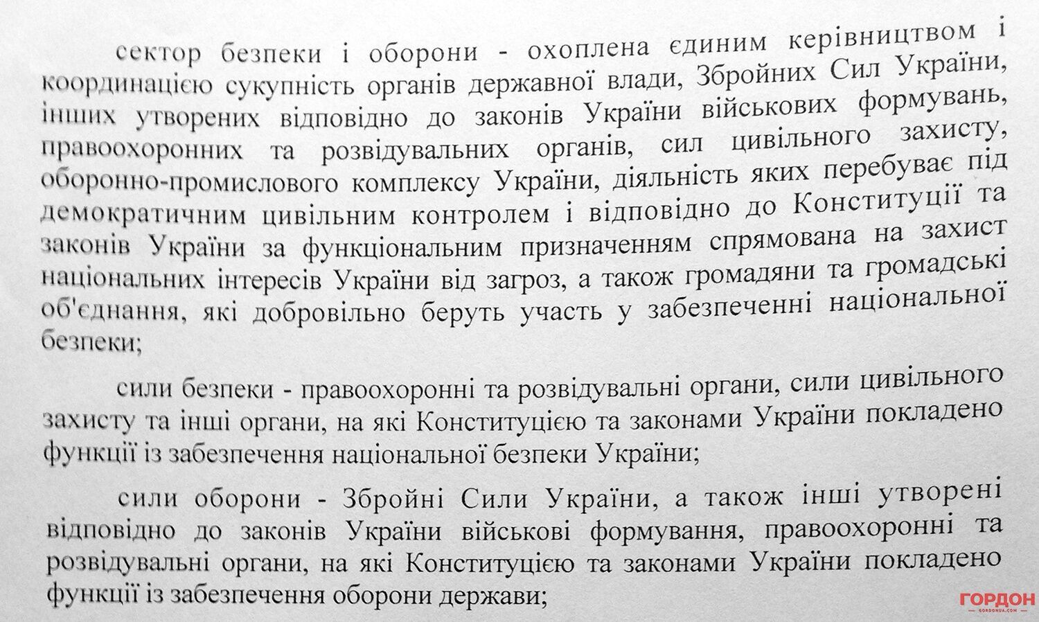 У розпорядженні редакції видання "ГОРДОН" є повний текст законопроекту "Про національну безпеку України", який, за словами наших джерел, до кінця цього тижня може подати до Верховної Ради президент Петро Порошенко. Джерела запевняють, що саме цю версію документа буде зареєстровано в парламенті. Публікуємо текст без скорочень та змін.