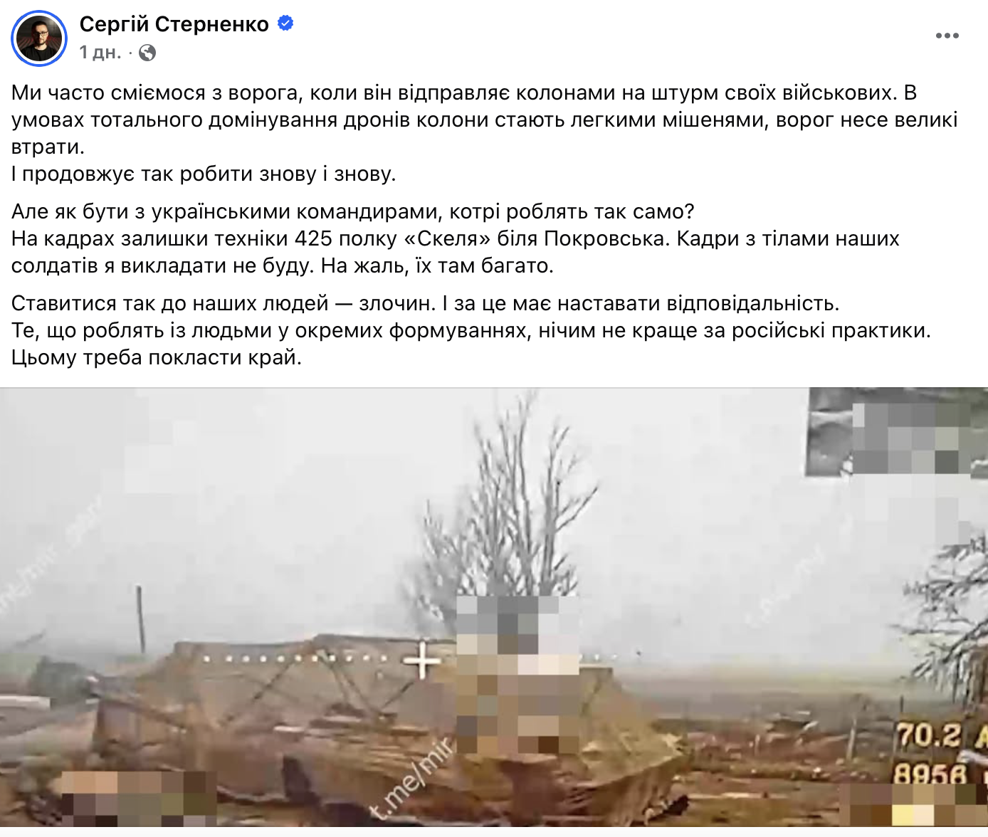 Радник міністра оборони з питань підвищення використання БПЛА на фронті Сергій Стерненко 1 квітня заявив про великі втрати 425-го окремого штурмового полку "Скеля" Сухопутних військ ЗСУ, який спрямували на штурм у районі Покровська з колоною військової техніки. У відповідь у полку заявили про успішну контратаку в місті й звинуватили Стерненка в тому, що він оцінював дії полку за відео з російських джерел. Після розголосу вище військове командування розпочало перевірку. Видання "ГОРДОН" зібрало всю інформацію щодо інциденту.