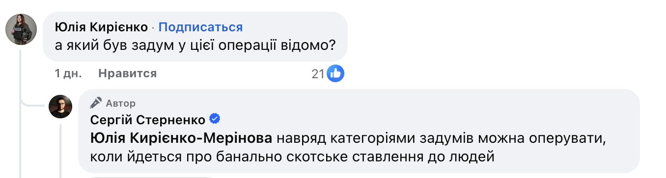 На запитання української журналістки Юлії Кирієнко-Мерінової під постом, чи відомо, який був задум у цієї операції, Стерненко відповів: "Навряд категоріями задумів можна оперувати, коли йдеться про банально скотське ставлення до людей".