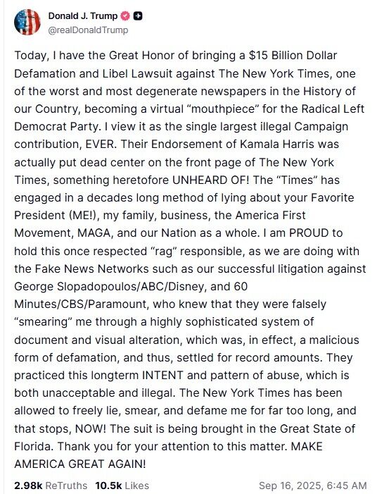 Президент США Дональд Трамп уночі 16 вересня оголосив у своїй соцмережі Truth Social, що подає проти однієї з найстаріших газет світу – The New York Times – позов на $15 млрд.
