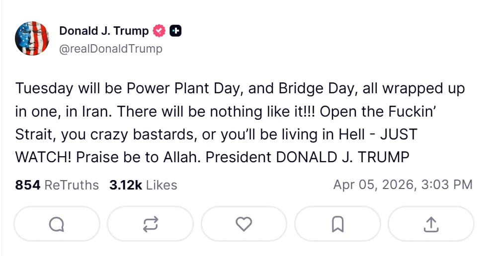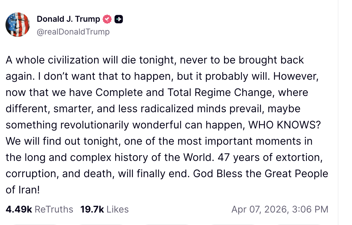 7 квітня Глава Білого дому у Truth Social написав, що "ціла цивілізація загине цієї ночі й вона ніколи більше не повернеться".