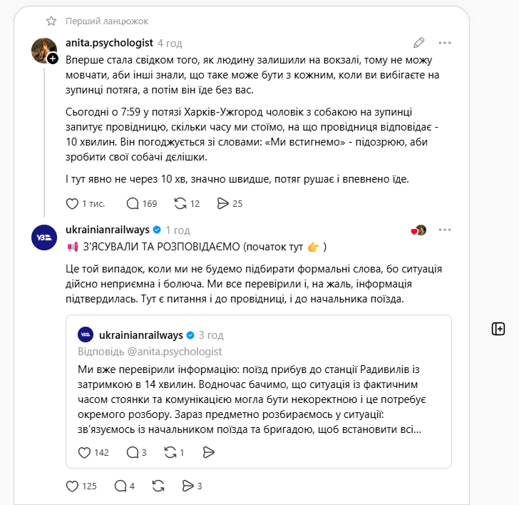 "Уперше стала свідком, як людину залишили на вокзалі, тому не можу мовчати, аби інші знали, що таке може бути з кожним, коли ви вибігаєте на зупинці потяга, а потім він їде без вас", – обурилася авторка поста.