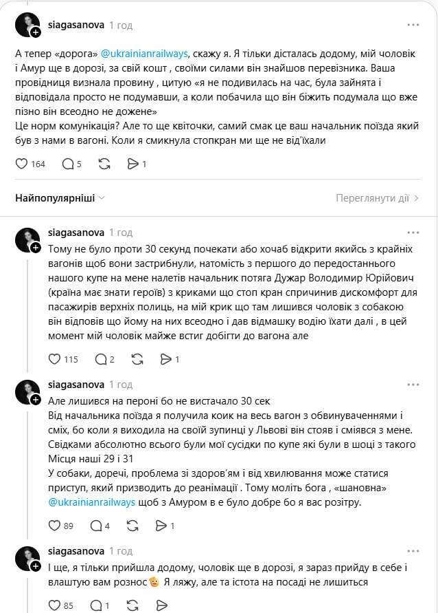 Ситуацію прокоментувала й Анастасія Гасанова – дружина чоловіка, який залишився на станції разом зі своїм улюбленцем. Вона зазначила, що також їхала разом із чоловіком у цьому поїзді й тепер домагатиметься звільнення начальника поїзда, який допустив цю ситуацію.