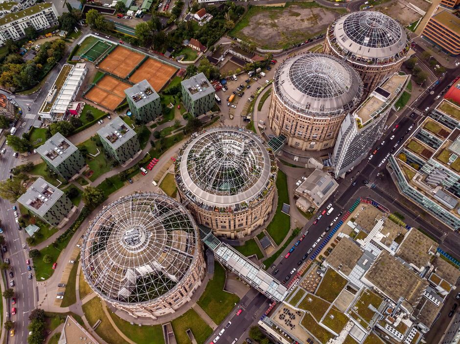 Фото: depositphotos.comЧотири газометри – резервуари для зберігання газу – побудували у Відні наприкінці XIX століття, вони стали найбільшими в Європі. Це чотири цегельні циліндри об'ємом по 90 тис. м³ кожен, висотою 70 м і діаметром 60 м. У сховищах запасали коксовий газ і звідси його подавали в міську мережу – спочатку тільки для вуличного освітлення, а потім і для приготування їжі, а також обігрівання будинків.