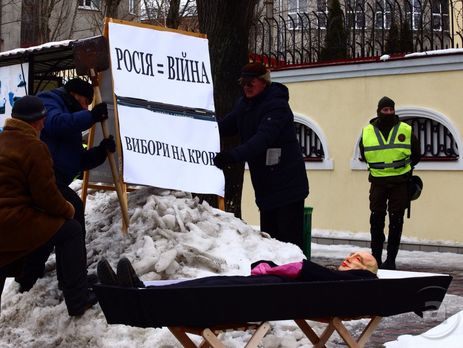 У Харкові до російського консульства принесли опудало Путіна у труні